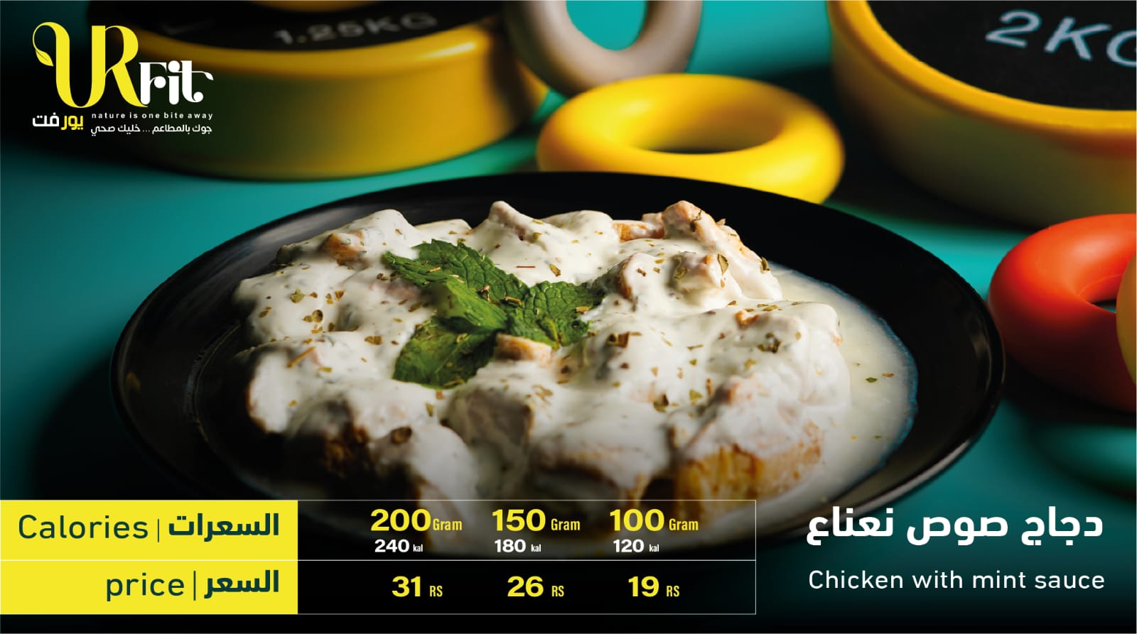 دجاج صوص نعناع من يورفت يقدم تجربة فريدة تجمع بين النكهة العربية الأصيلة و الصوص الكريمي المنعش. قطع الدجاج الطرية مغموسة بصوص النعناع الطازج الذي يمنحك شعوراً بالانتعاش والخفة بعد كل لقمة – وجبة مثالية بعد يوم طويل أو تمرين شاق تعيد لك حيويتك بدون ثقل أو سعرات زائدة.
