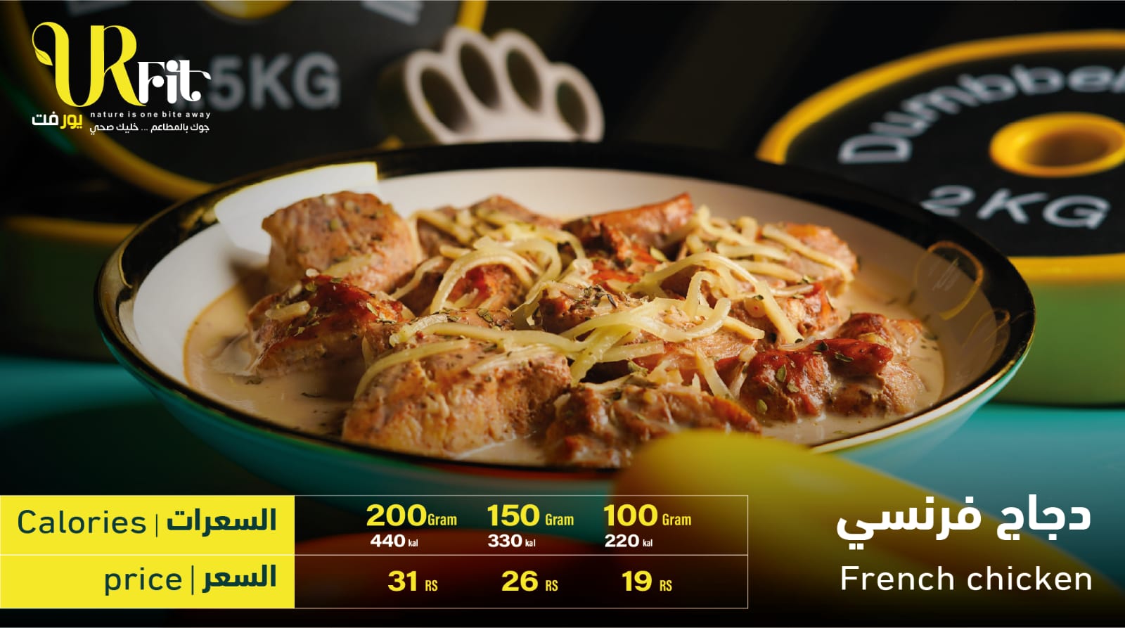 دجاج فرنسي من يورفت يأخذك في رحلة إلى المطبخ الفرنسي الراقي – قطع دجاج طرية مغطاة بصوص كريمي غني ومزينة بطبقة من الجبنة الذهبية المذابة. وجبة تجمع بين الأناقة الأوروبية والحساب الدقيق للقيم الغذائية، لتمنحك تجربة طعام فاخرة لا تخرجك عن مسارك الصحي